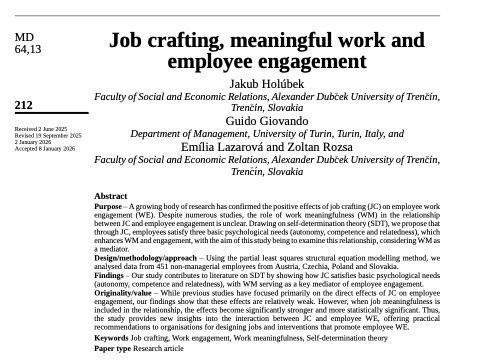 Publikácia v časopise Management Decision: Ako zmysluplnosť práce zvyšuje angažovanosť zamestnancov